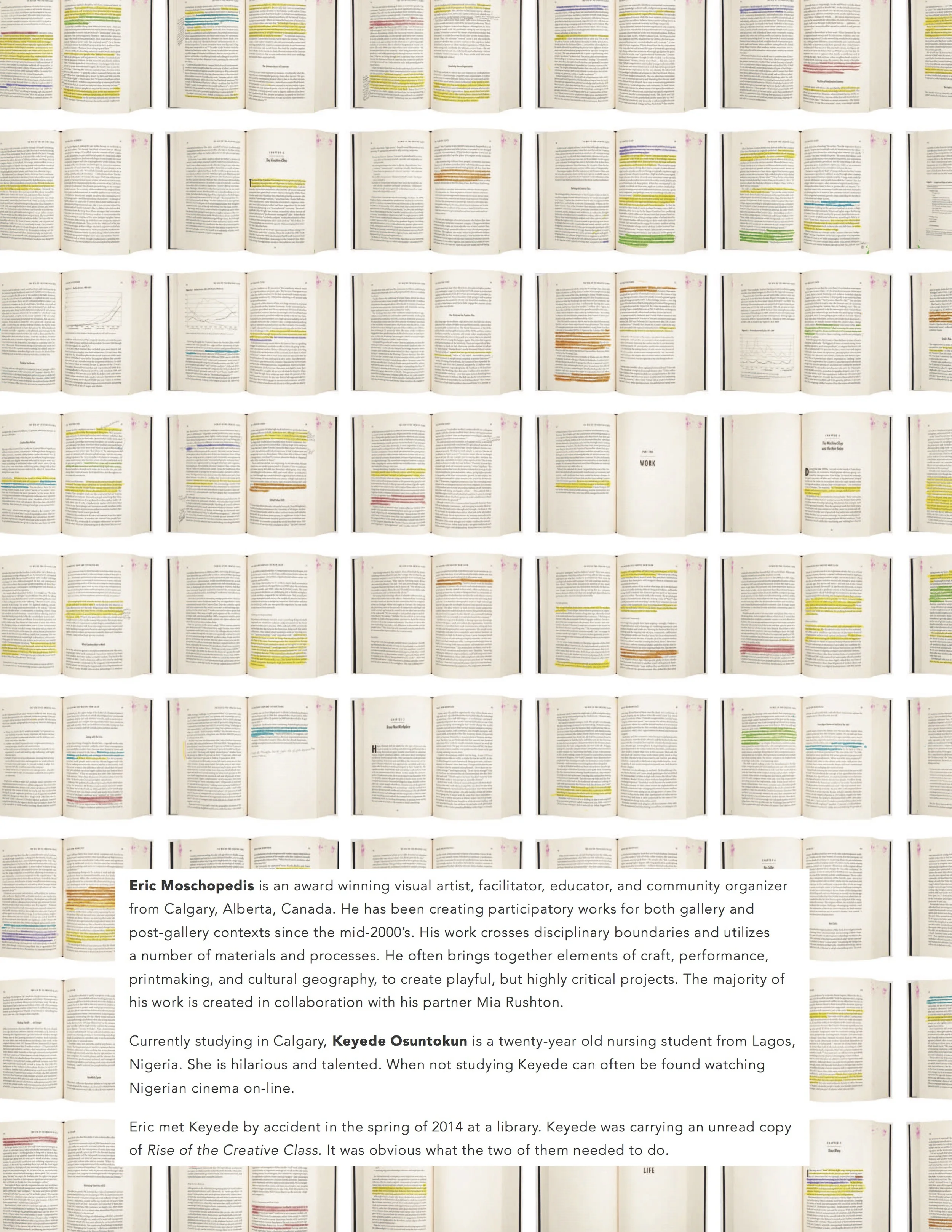 In 2012, Richard Florida published the 10th Anniversary Edition of The Rise of the Creative Class. Over the decade since its original publication, Florida’s theories of creative capitalism and urban planning strategies have both positively and negatively impacted social and spatial practices here in Calgary and many other Western cities. Early in 2014, Eric and Keyede agreed to intervene into Florida’s toxic discourse by reading and studying their own copies of the 2012 edition of Rise of the Creative Class, highlighting sections of the book based on a set of five critical and affective criteria. Over several months, Moschopedis and Osuntokun filled up Florida’s pages with highlighter ink and marginalia—inscribing onto the pages their own personalities, identities, histories, politics, and affects.
